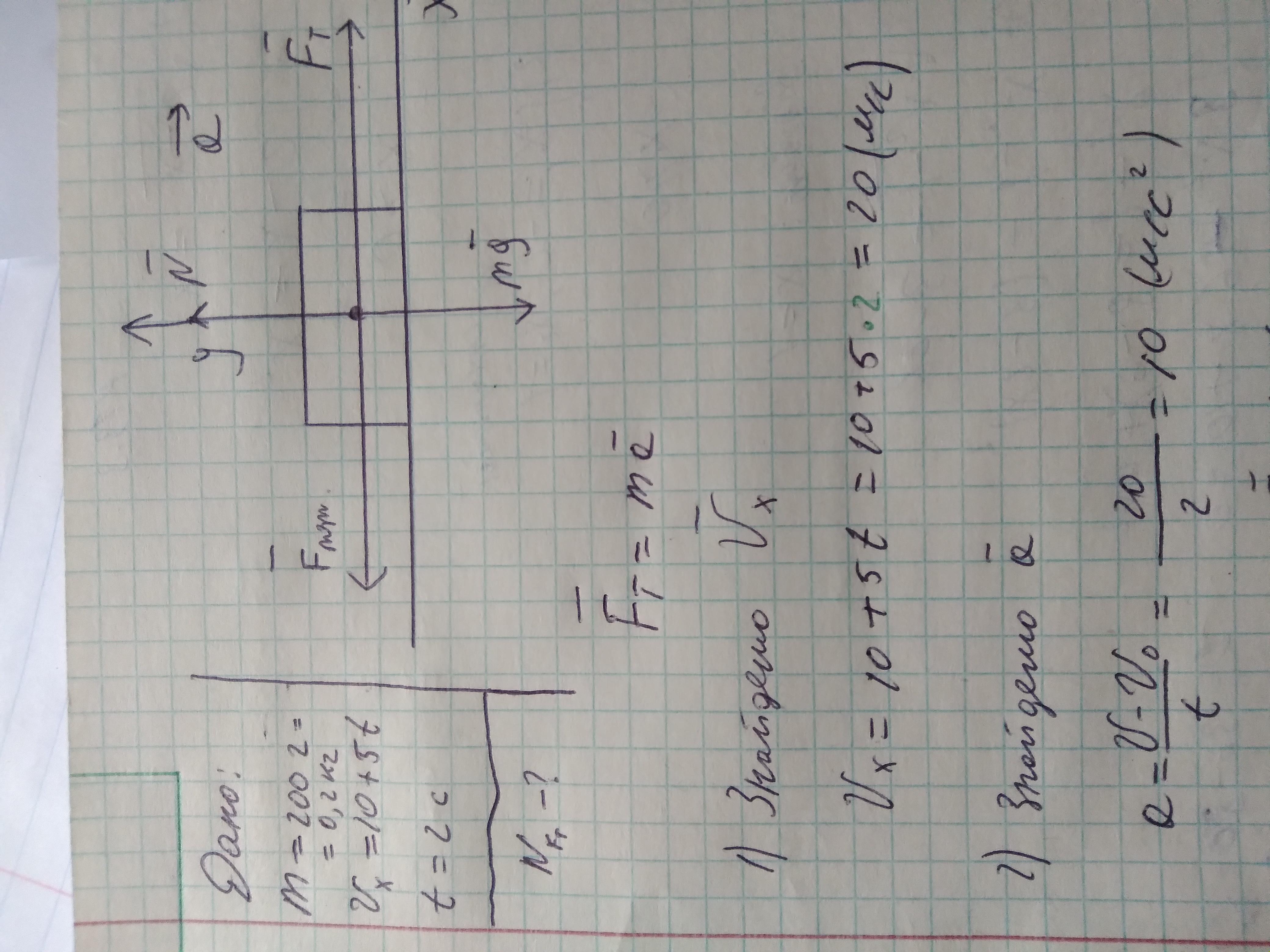 Тіло, маса якого дорівнює 200г, рухається вздовж осі Ох так, що його швидкість к СІ змінюється за законом vx=10+5t. Визначте потужність сили тяги в момент часу 2 с