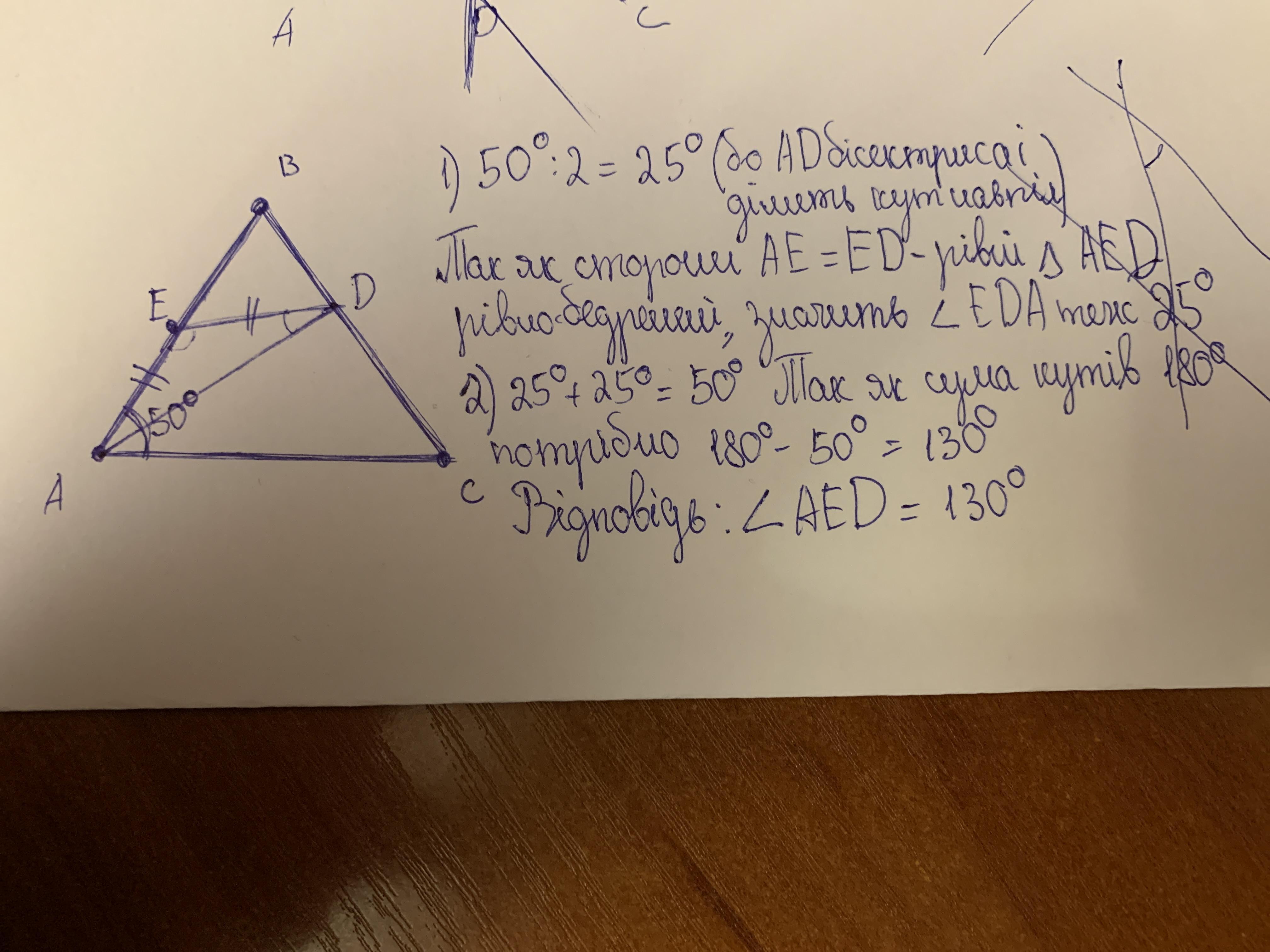 Отрезок AD — биссектриса треугольника АВС. Через точку D проведена прямая, пересекающая сторону АВ в точке Е так, что АЕ = ED. Найдите величины углов треугольника AED, если угол ВАС равен 50°.