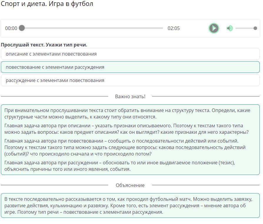 Спорт и диета. Игра в футбол 00:00 02:05 О) Прослушай текст. Укажи тип речи. рассуждение с элементами повествования Описание с элементами повествования повествование с элементами рассуждения