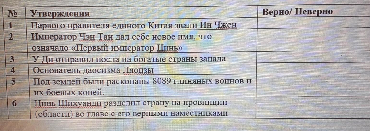 Верн Утверждения Первого правителя единого Китая звали Ин Чжен Император Чэн Тан дал себе новое имя, что означало «Первый император Цинь» У Ди отправил посла на богатые страны запада Основатель даосизма ЛяоцЗЫ Под землей были раскопаны 8089 глиняных воинов и их боевых коней. Цинь Шихуанди разделил страну на провинции (област) во главе с его вернымII наместниками