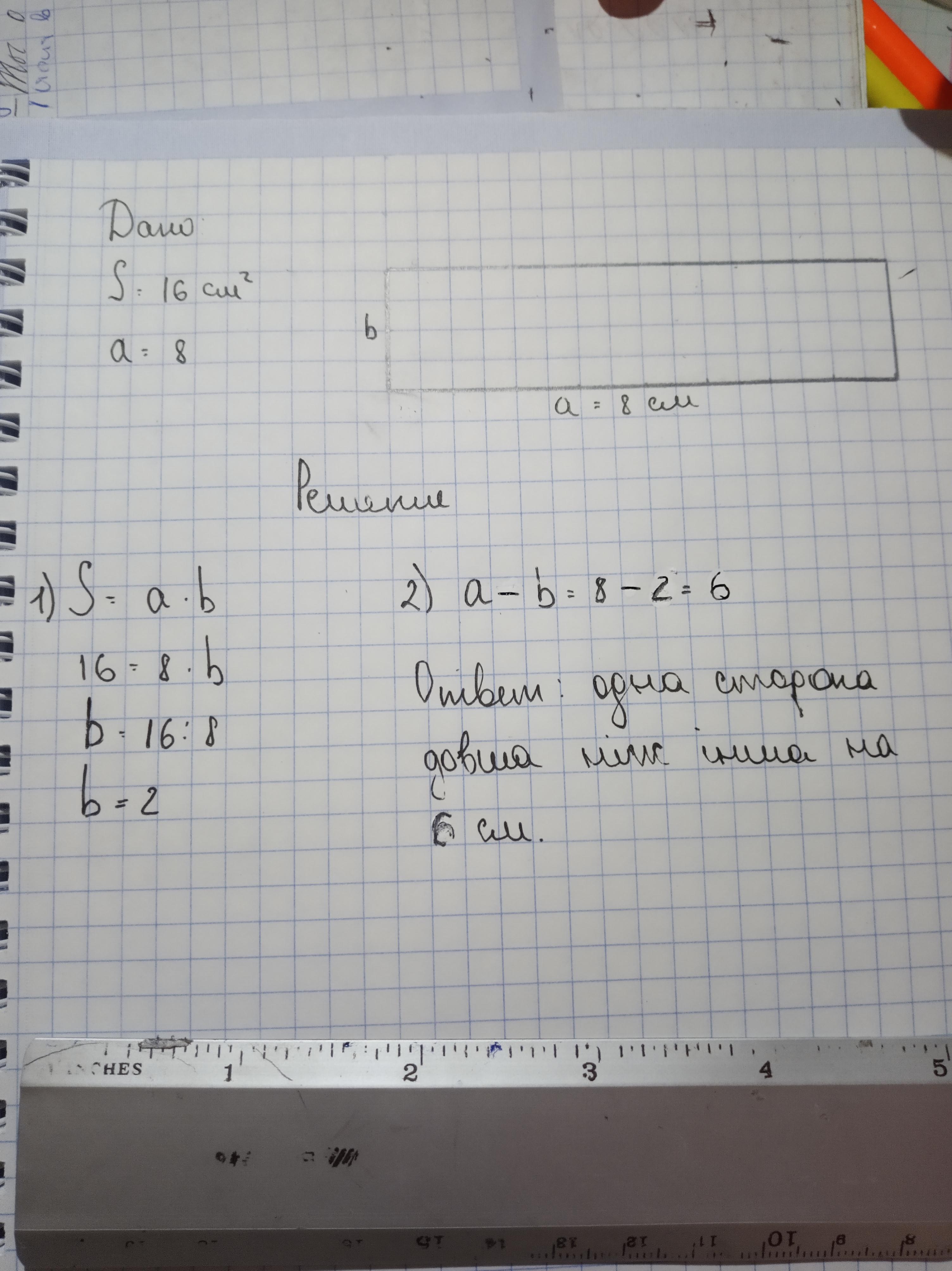 Побудуй прямокутник, площа якого 16 квадратних см,а одна із сторін дорівнює 8 см.На скільки сантиметрів одна сторона прямокутника довша,ніж інша сторона?