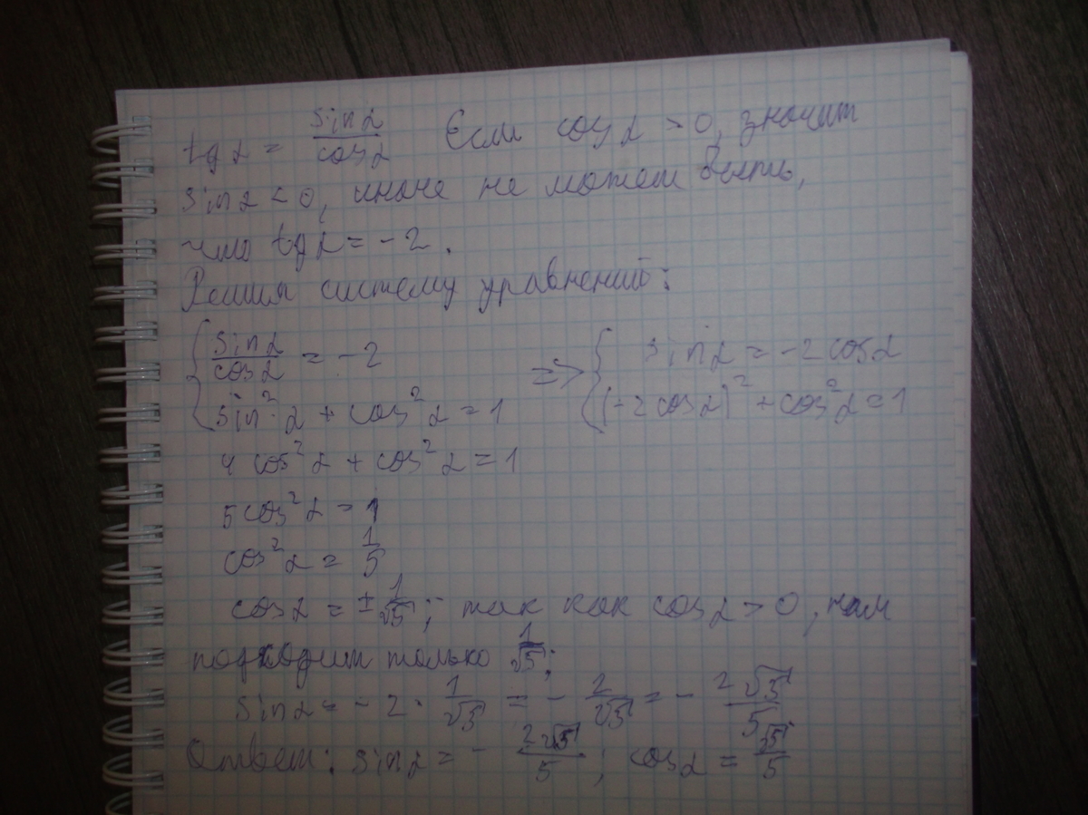 НАЙДИТЕ СИНУС АЛЬФА И КОСИНУС АЛЬФА, ЕСЛИ ИЗВЕСТНО , ЧТО ТАНГЕНС АЛЬФА= -2,КОСИНУС>0 . ЗАРАНЕЕ СПАСИБО