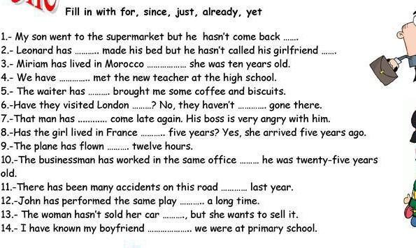 13.- The woman hasn't sold her car. ....but she wants to sell it. 14.- I have known my boyfriend ......we were at primary school.