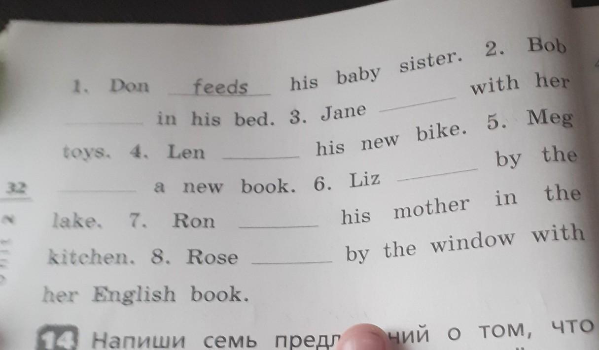 Ответ:2.Bob sleeping in his bed 3.Jane playing with her toys 4.Len riding his new bike 5. Meg reading a new book 6. Liz swimming by the lake 7. Ron helps his mother in the kitchen 8. Rose sits by the window with her English book.
