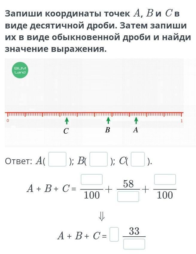 запиши координаты точек А В и С в виде десетичнеой дроби затем запиши их в виде обыкновенной дроби