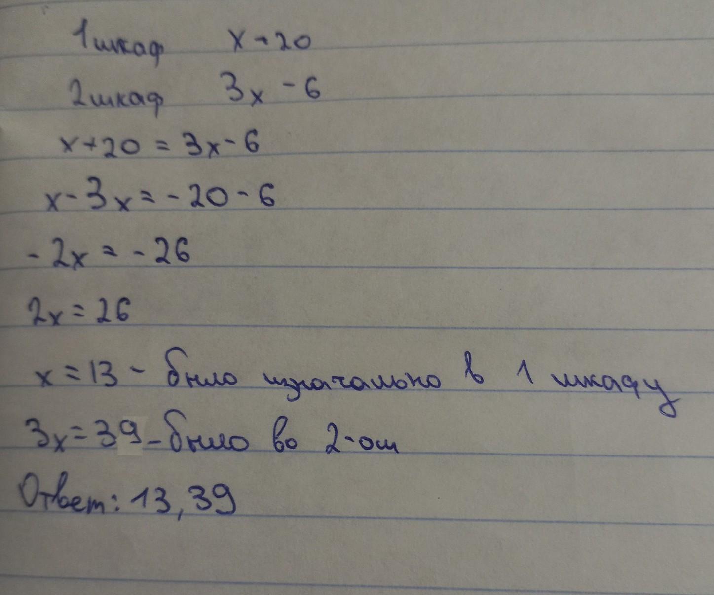 4. В одном шкафу было в 3 раза меньше книг, чем в другом. Когда в первый шкаф положили 20 книг, а из второго взяли 6, то в обоих шкафах книг стало ровно поровну. Сколько книг было в каждом шкафу. СРОЧНО!