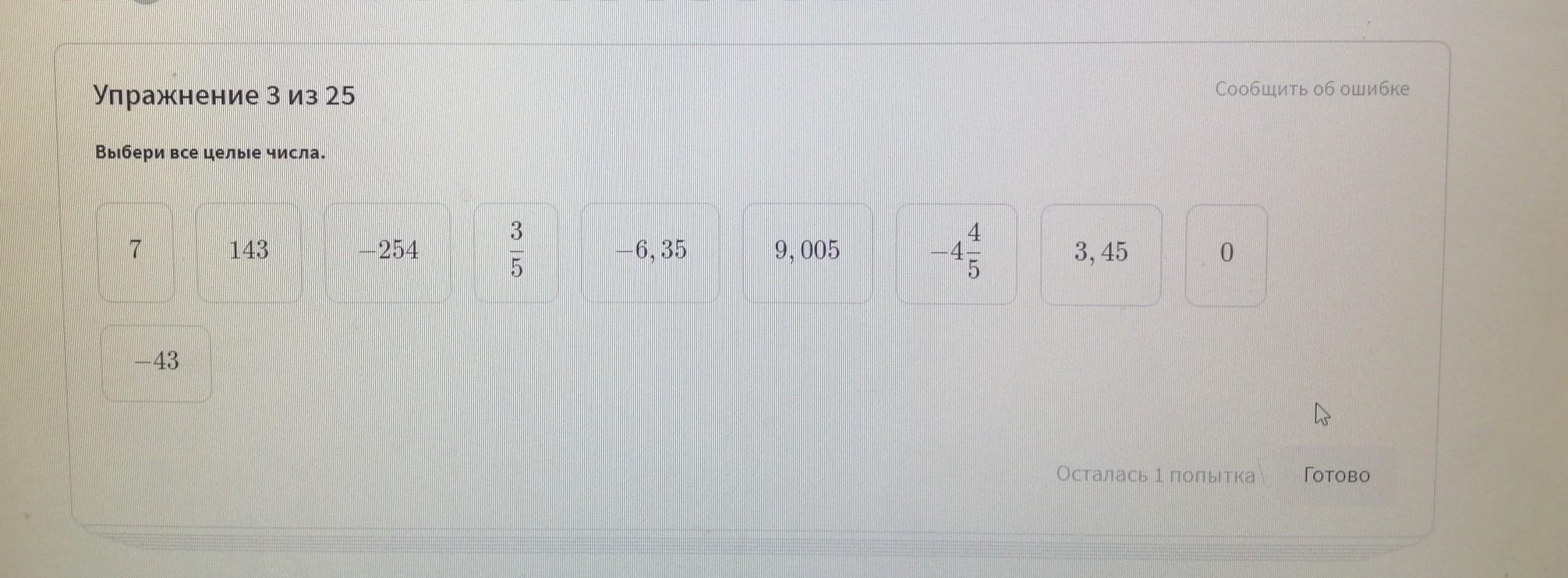 7,143,0,-43.целые числа это числа не имеющие дроби. 0 и с минусом тоже целые числа