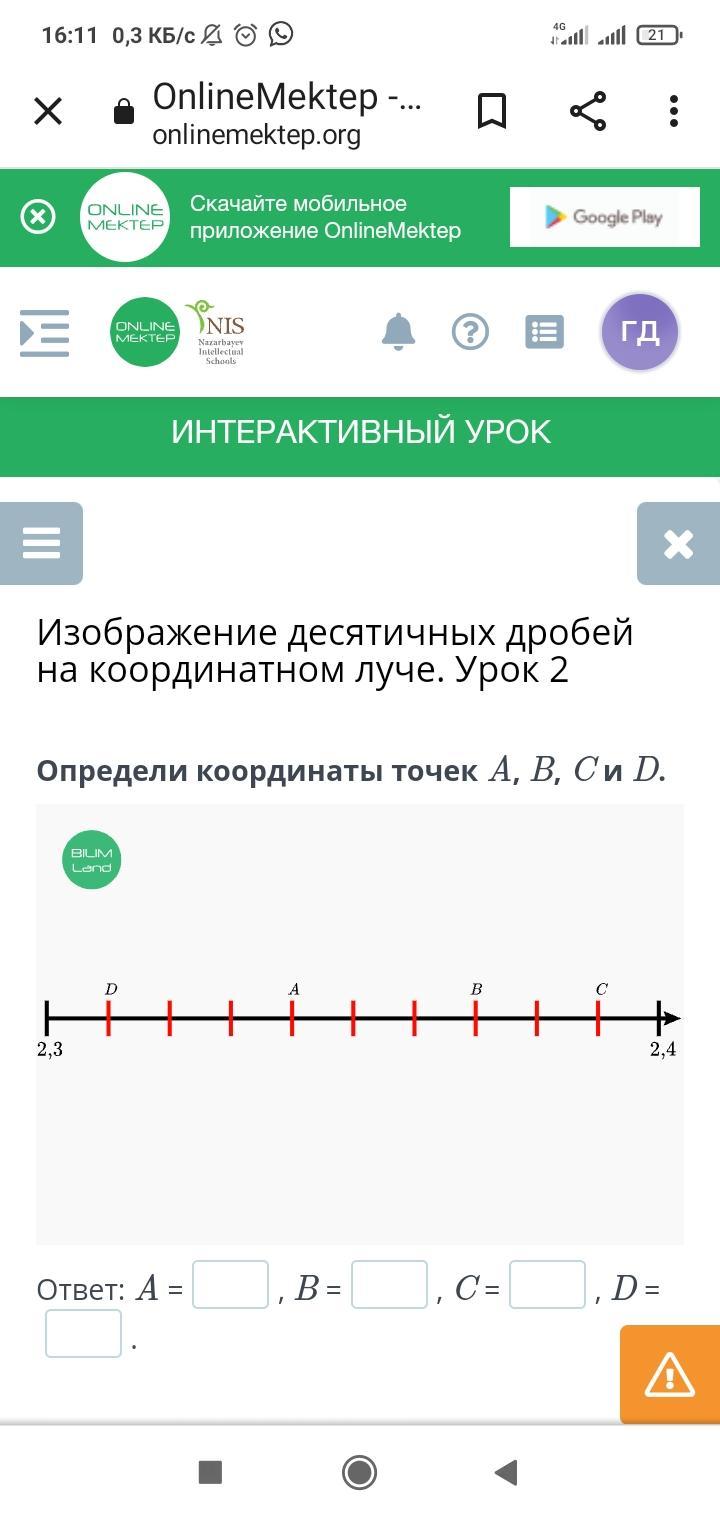 Изображение десятичных дробей на координатном луче. Урок 2 Определи координаты точек A, B, C и D. Ответ: A = , B = , C = , D = .