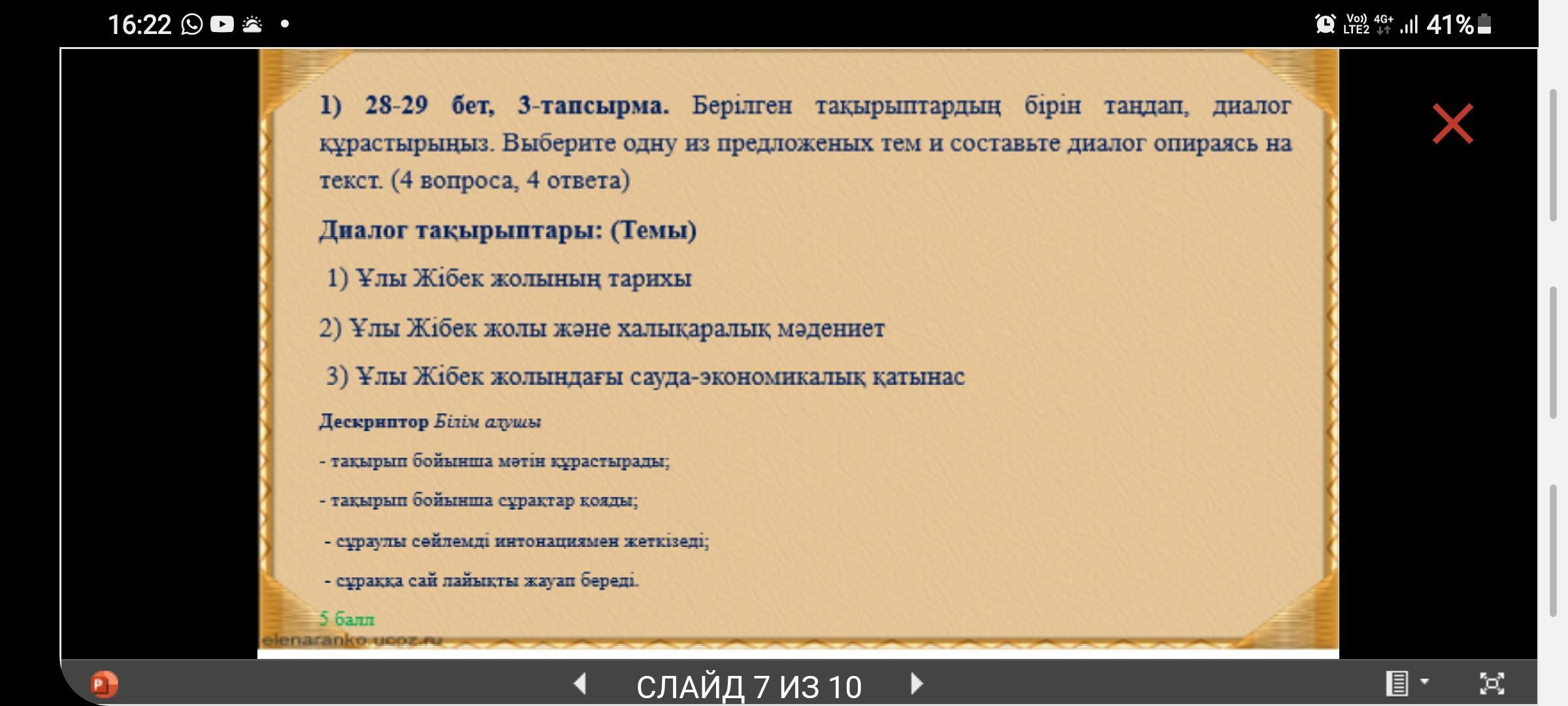 Алмасбек : Аспандияр , сен Қазақстандағы көне қалалар жайлы естуің бар ма ? Аспандияр : Ия , достым , кезінде Ұлы Жібек жолының бойында Түркістан , Тараз , Отырар секілді қалалар орналасқан болатын . Жай сұрадың ба ? Алмасбек : Мен оқушылар сарайында « өлкетану » үйірмесіне қатысушы едім ғой , есіңде ме ? Сол үйірменің жетекшісі мен қатысушыларымен бірге келер демалыста « Ұлы Жібек жолы бойындағы Қазақстанның көне қалалары » атты үш күндік сапарға аттанамыз . Аспандияр : Қандай керемет ! Әттең , мен де сол үйірмеге қатыспаппым , әйтпегенде менің де бұл сапарға аттанғым келетін еді . Тарихи деректерге толы , маңызды сапар болатын сияқты . Алмасбек : Ия , мен де солай ойлаймын . Сондықтан қазірден кішкене болса да дайындалып , қосымша мәлімет жинап жүрмін .