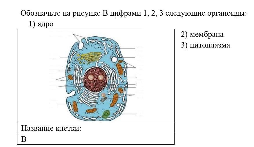 Обозначьте на рисунке В цифрами 1, 2, 3 следующие органоиды: 1) ядро 2)мембрана 3)цитоплазма