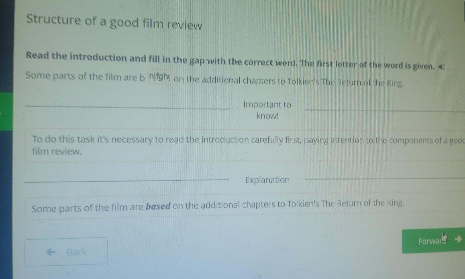 Read the introduction and fill in the gap with the correct word. The first letter of the word is given. Some parts of the film are b on the additional chapters to Tolkien's The Return of the King. Back Check пжжжж помогите
