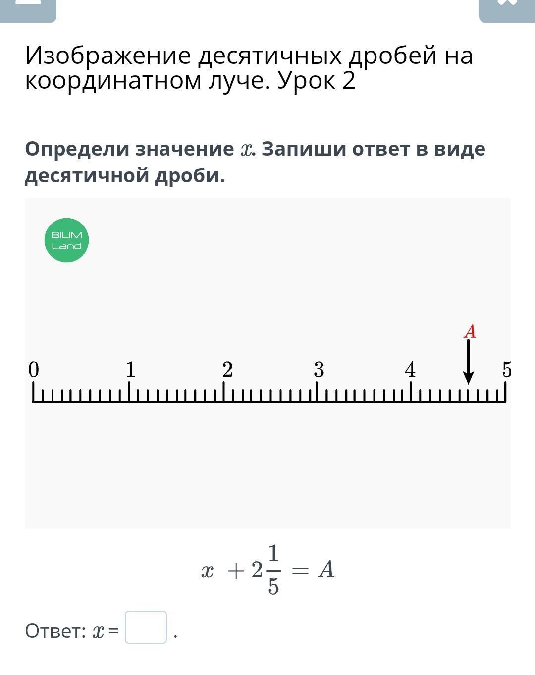 Изображение десятичных дробей на координатном луче. Урок 2 Определи значение x. Запиши ответ в виде десятичной дроби. Ответ: x = .