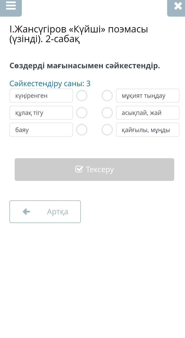 Сөздерді мағынасымен сәйкестендір. сәйкестендіру саны: 3 күңіренген мұқият тыңдау құлақ тігу асықпай, жай баяу қайғылы, мұңды