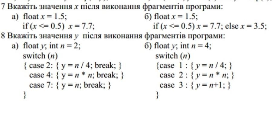 б) n = 4, умови що відповідає 4 у switch-case немає, тому значення залишиться тим, що було при ініціалізації, тобто y = 0