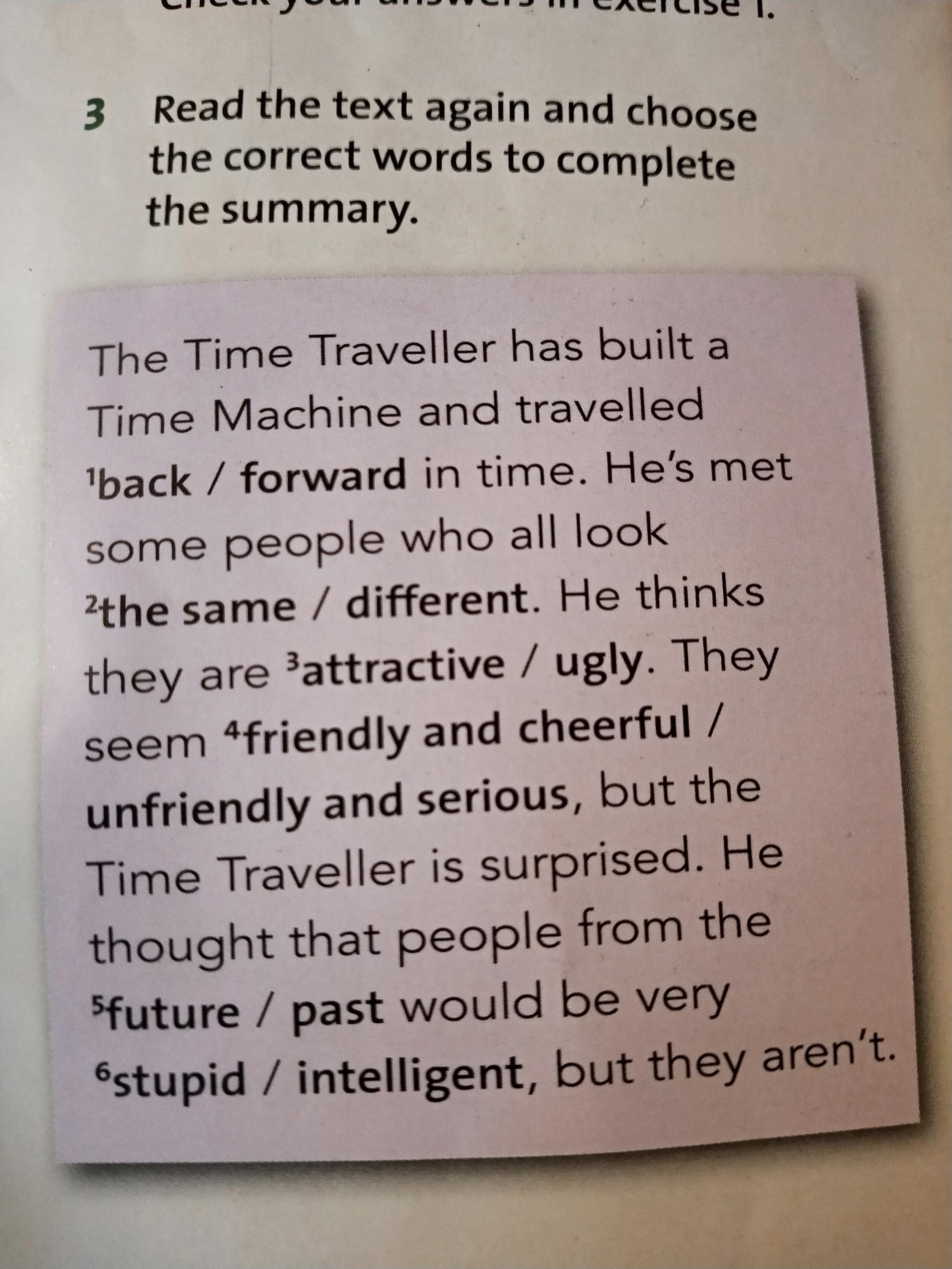 3 Read the text again and choose the correct words to complete the summary. The Time Traveller has built a Time Machine and travelled ¹back / forward in time. He's met some people who all look ²the same/ different. He thinks they are ³attractive / ugly. They seem 4friendly and cheerful / unfriendly and serious, but the Time Traveller is surprised. He thought that people from the "future / past would be very 6stupid / intelligent, but they aren't.