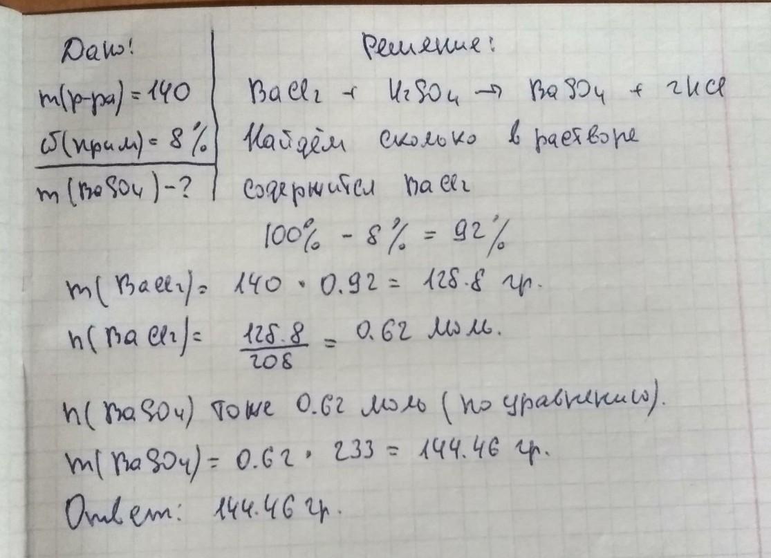 Вычислите массу сульфата бария полученого из 140 г хлорида бария содержащего 8 % примесей, и серной кислоты.