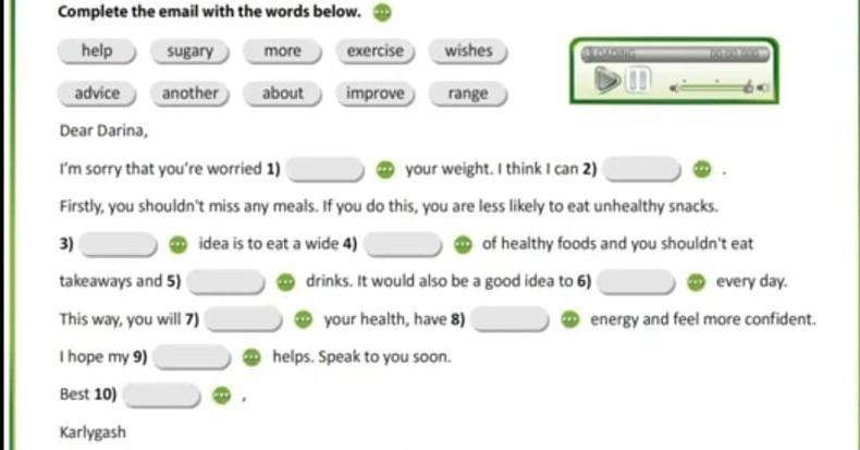 Уважаемая Дарина, мне жаль, что вы беспокоитесь 1) ваш вес. Я думаю, что могу 2) Во-первых, вы не должны пропускать приемы пищи. Если вы сделаете это, вы с меньшей вероятностью съедите нездоровые закуски. 3) идея состоит в том, чтобы есть широко 4) O здоровой пищи, и вы не должны есть еду на вынос и 5) напитки. Также было бы неплохо 6) каждый день. Таким образом, у вас будет 7) здоровье, 8) энергия и чувство уверенности. Я надеюсь, что мой 9) поможет. Поговорим с вами в ближайшее время. Лучшие 10) Карлыгаш