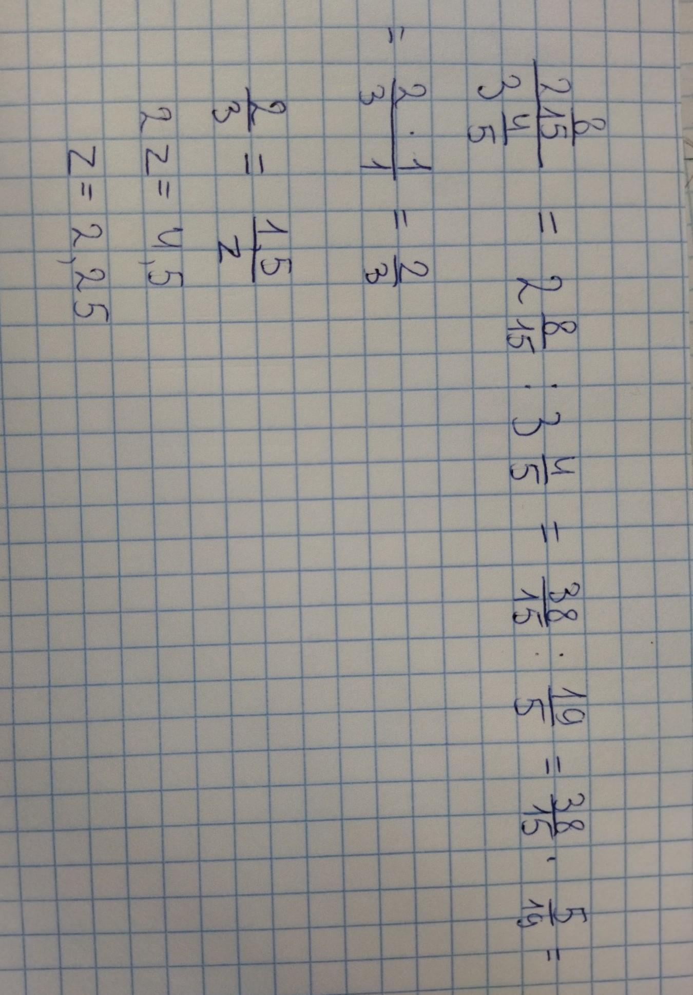 Тут все достаточно несложно, мы просто преобразуем первую дробь, упрощаем ее. Сначала, записываем не в виде дроби, а в виде деления через " : ". Затем переводим в неправильную дробь и сокращаем.
