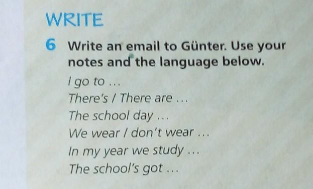 WRITE 6 Write an email to Güntet. Use your notes and the language below. I go to There's / There are The school day We wear I don't wa in my year we study The schools got