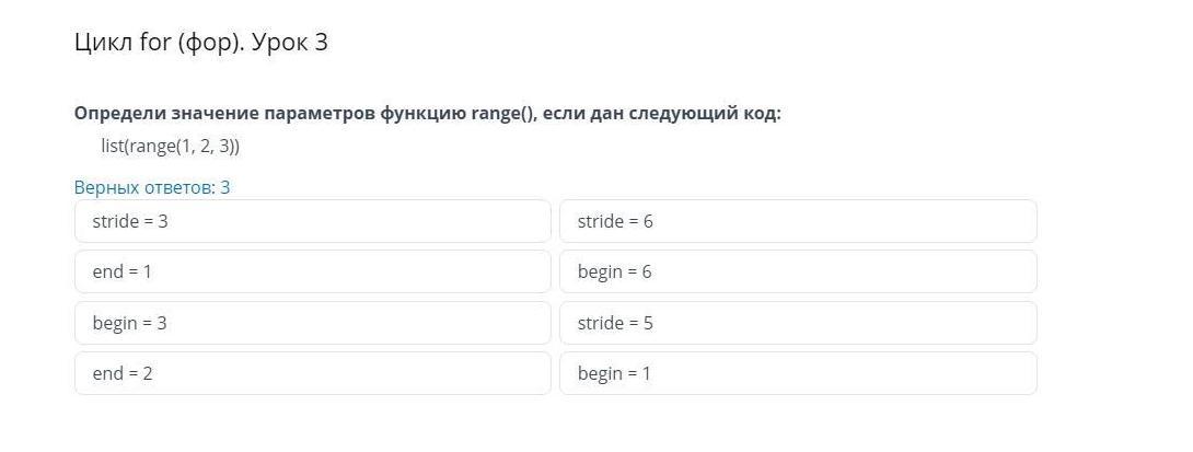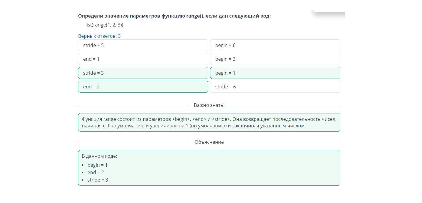 Определи значение параметров функцию range(), если дан следующий код: