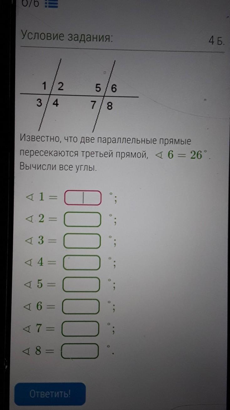 пусто в тесте впиши что углы 2, 3 и 7 тоже равны 26⁰