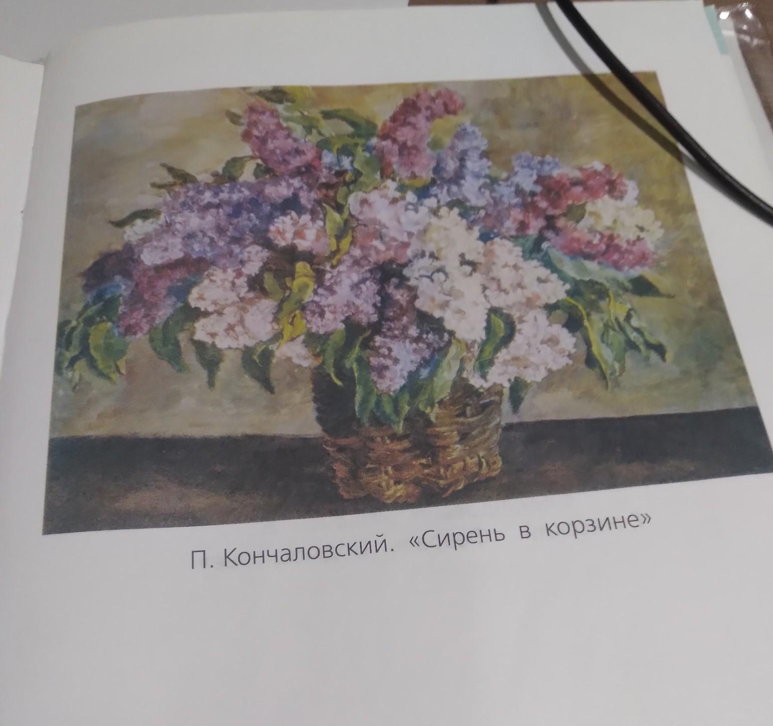 Картина Петра Кончаловского "сирень в корзине" была написана в 1933 году. Сама картина являеться натюрмортом. Мягким контрастом цвета отделен фон от деревянного стола, на котором помещена сплетёная корзинка, из ивы. Корзинка не являеться пустой, она наполнена цветами сирени. Цветами абсолютно разного цвета. Сильно привлекаюшими внимание зрителя. Xудожник пытался передать его теплую любовь к природе.