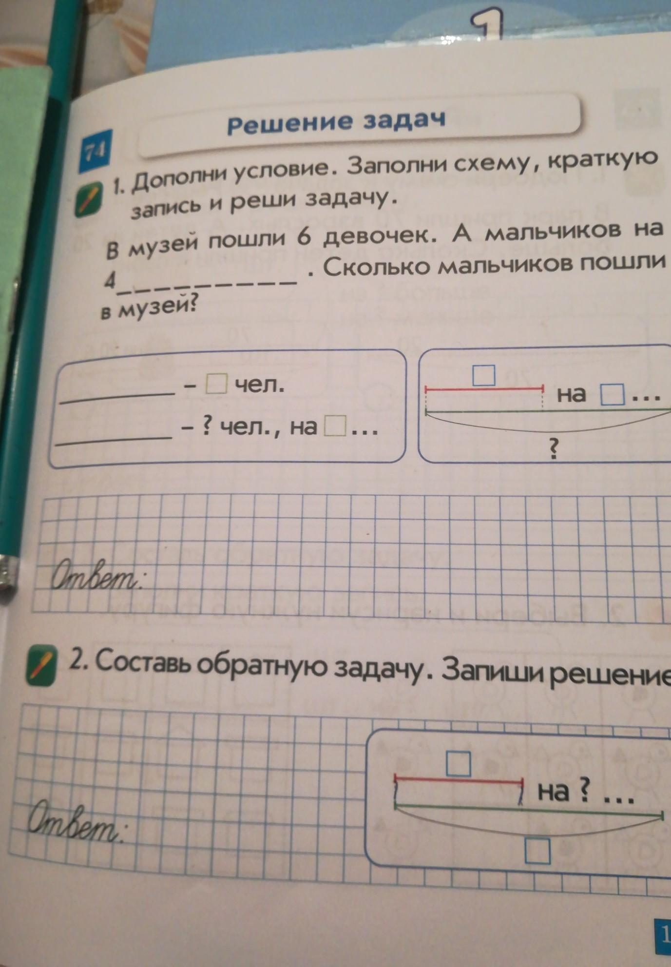 74 Решение задач 1. Дополни условие. Заполни схему, краткую запись и реши задачу. В музей пошли 6 девочек. А мальчиков на 4 Сколько мальчиков пошли в музей? - Пчел. ? чел., на ... на ... ?