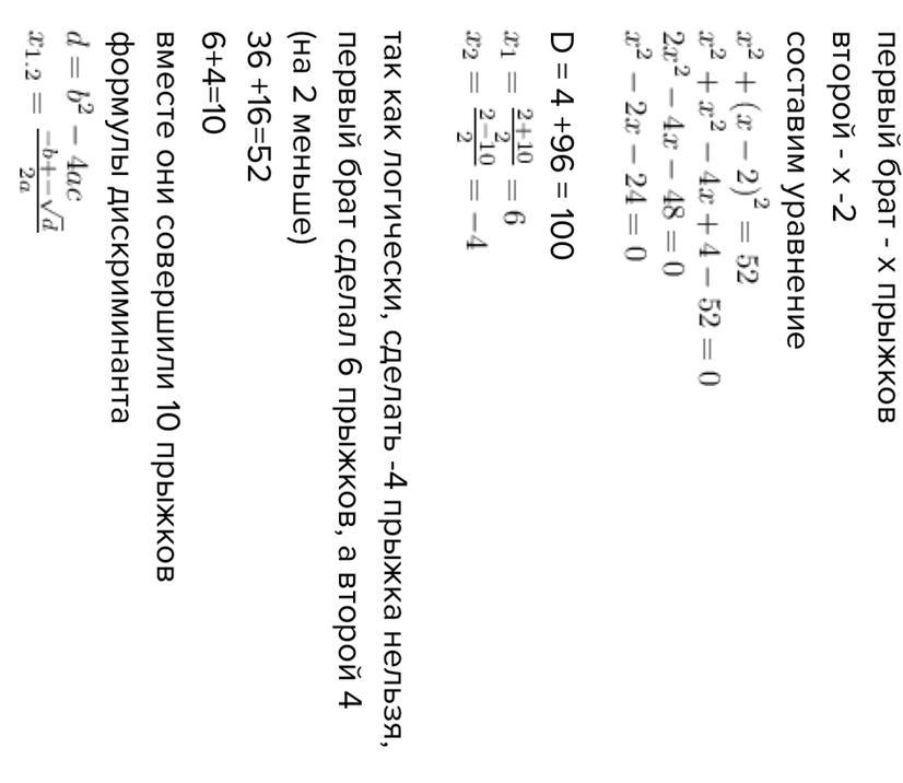 Один из братьев совершил на 4 прыжка с парашютом меньше, чем другой. Сумма квадратов количества прыжков каждого из братьев равна 106. Сколько прыжков совершили ребята вместе