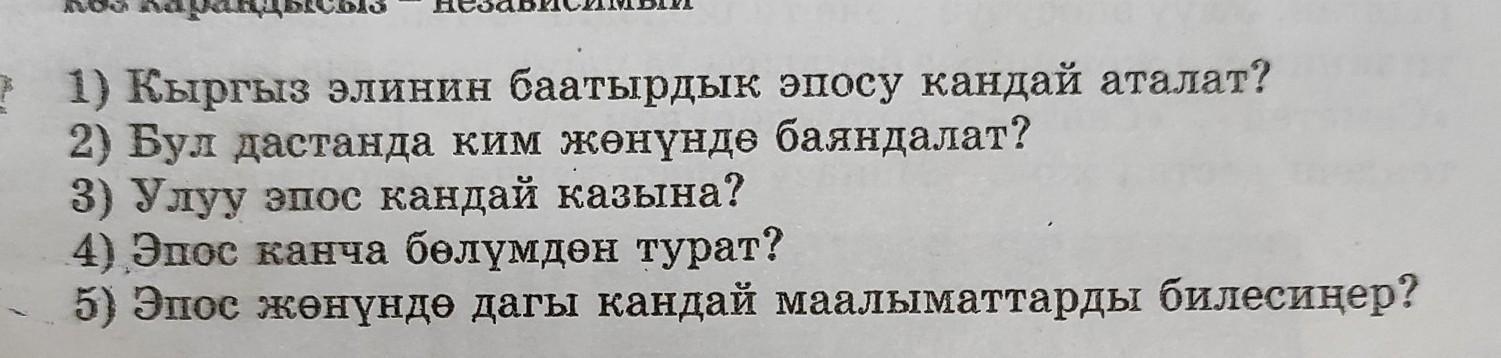 1) Кыргыз элинин баатырдык эпосу кандай аталат? 2) Бул дастанда ким жөнүндө баяндалат? 3) Улуу эпос кандай казына? 4) Эпос канча бөлүмдөн турат? 5) Эпос жөнүндө дагы кандай маалыматтарды билесиңер? дам 20 баллов