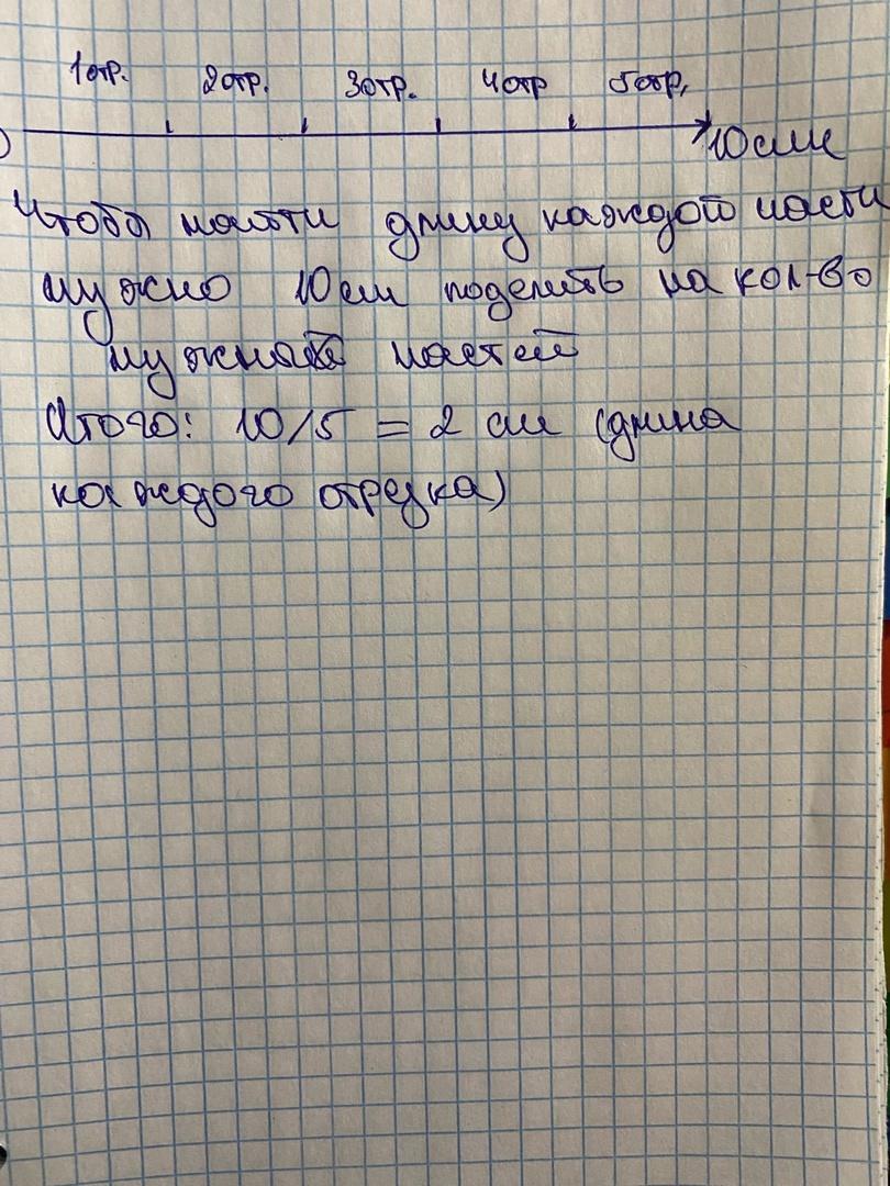Построй отрезок длиной 10 см. Раздели его на 5 равных частей.Какая длина каждой части? Проверь вычисления с помощью линейки.(с нарисованным отрезком плиз )