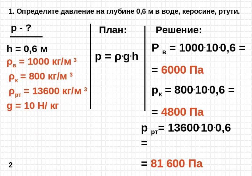 Ответ: 6кПа; 4,8 кПа; 81,6кПа. P-Давление. p-плотность. h-глубина. P=p*g*h=1000*10*0.6=6000 Па для воды.