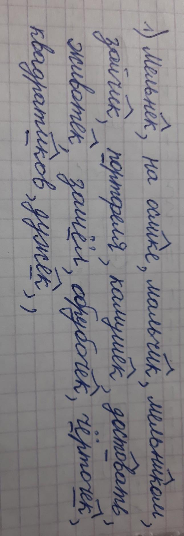 1) Мельн..к на осл..ке ехал верхом, мальч..к за мельн..ком3 плёлся пешком. (С.Маршак) 2) Зайч..к прыгает по парте и по карте на стене. (С.Маршак) 3) Вот он (Томка) вылез из п..ртфеля, увидал, как камуш..к плюхнулся в воду, и побежал его дост..вать. Сначала по живот..к заш..л, потом по шею, а потом и весь окунулся. Только хвост-обрубоч..к торчит наружу. (Е.Чарушин) 4) У полинезийцев каждый рисунок имеет своё значение. Узор из ч..рточ..к и квадрат..ков говорит о походах3, в которых участвовал воин. Узор из белых дуж..к и чёрных кружочков – это память о победах, одержанных вождём над врагами3. (М.Ильин)