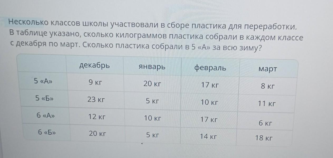 несколько классов школы участвовали в сборе пластика для переработки в таблице указано Сколько килограммов в пластинках собрали В каждом классе с декабря по Март сколько пластика собрали в пятом А за всю зиму