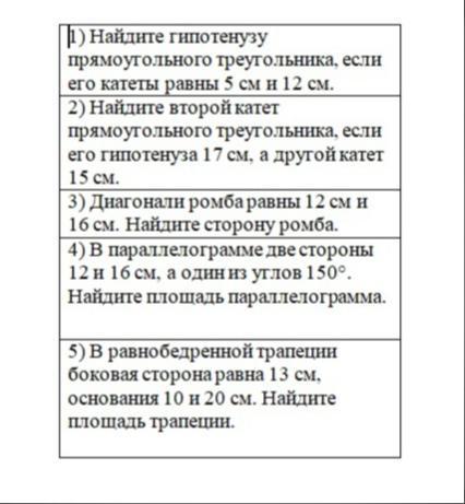 Ответ:1.Теорема пифагора. sqrt(5^2+12^2)=sqrt(169)=132.теорема пифагора sqrt(289-225)=83.Диагонали в точке пересечения делятся пополам. Теорема пифагора sqrt(36+64)=104.Аналогично третьему 12.5.второй угол=30(90-150=30) высота = 6(катет напротив 30 равен половине гипотенузы S=16*6=966.В равнобедренном высота также медиана => основание=2*sqrt(169-25)=24 S=24*5/2=607. h=sqrt(169-25)=12 S=(10+20)*12/2=1808.CH=CD=10(Углы C и D =45) AH=18-10=8 =>BC=8 S=(18+8)*10/2=130Прости, что кратко, уж очень много писать