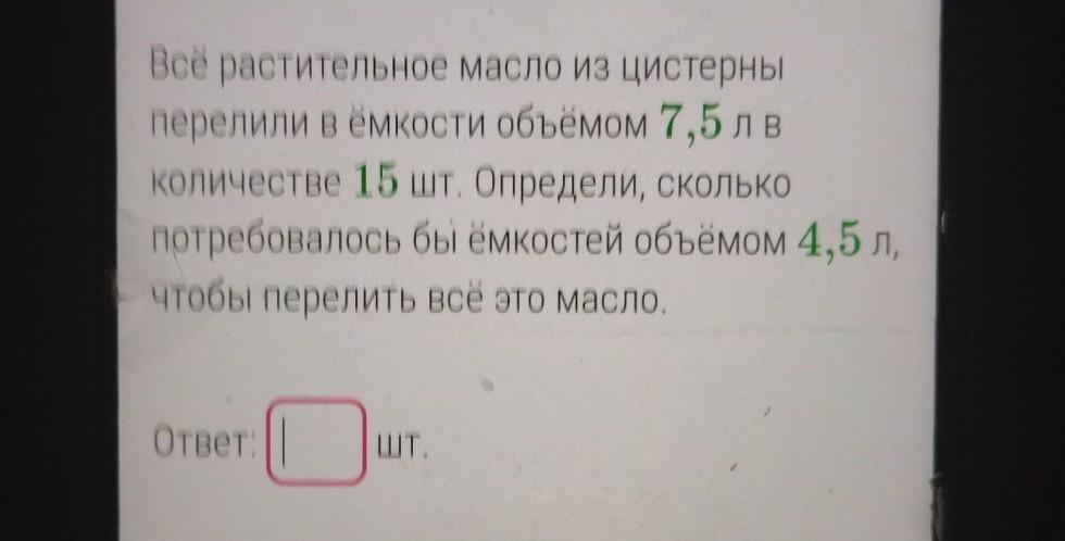 Всё растительное масло из цистерны перелили в ёмкости объёмом 7,5лв количестве 15 шт. Определи, сколько потребовалось бы ёмкостей объёмом 4,5 л, чтобы перелить всё это масло.