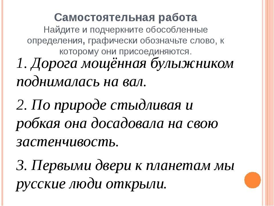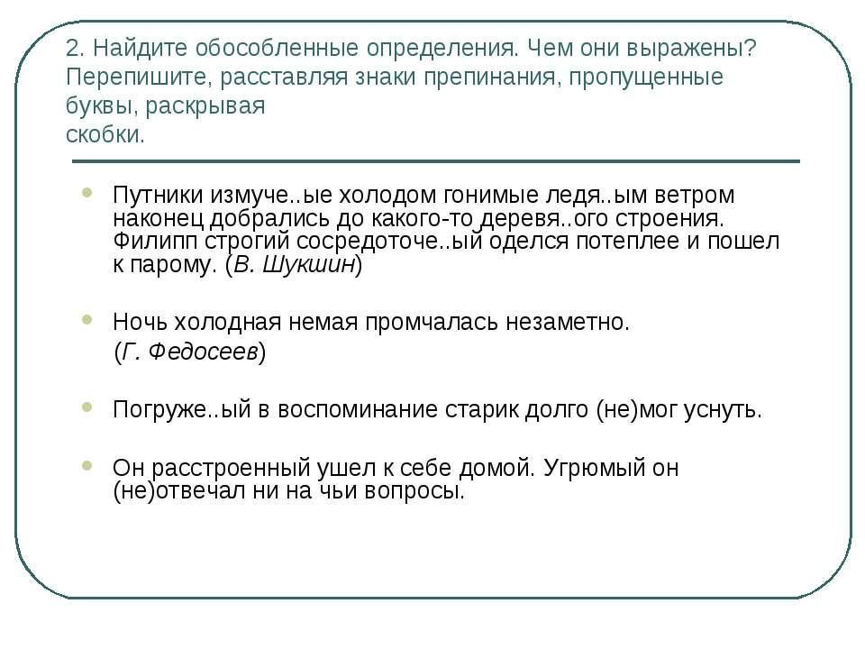 Обособленные определения я выделила жирным, вот. Во втором задании курсивом обозначены определяемые слова.