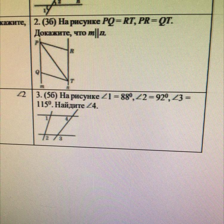 3. Сначала докажем, что прямые параллельны. Найдём смежный с углом 2 угол: 180-92=88. Значит, этот угол и угол 1 равны, а они накрест лежащие. Следовательно, прямые параллельны. Теперь найдём смежный с углом 3 угол: 180-115=65°. Этот угол и угол 4 накрест лежащие, а следовательно, равны.