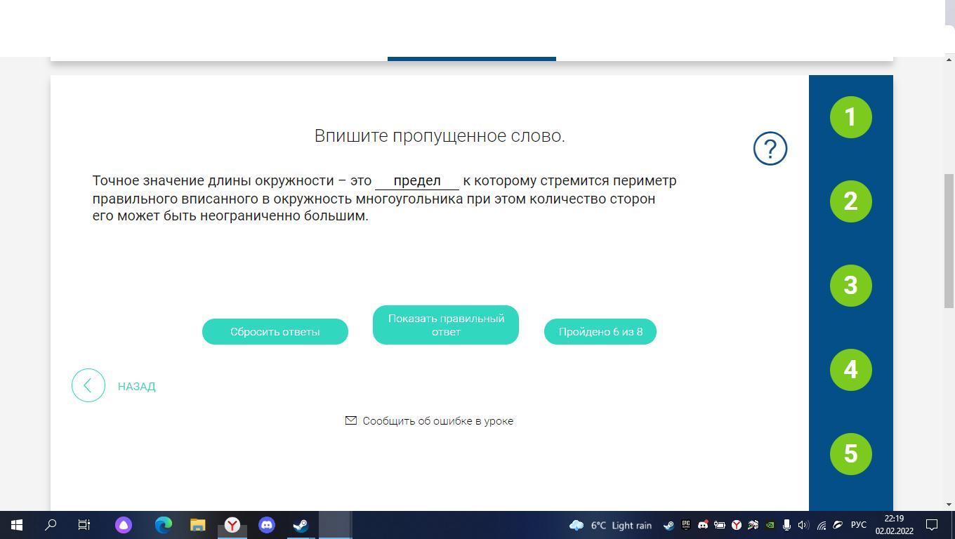 Точное значение длины окружности – это предел, к которому стремится периметр правильного вписанного в окружность многоугольника при неограниченном увеличении числа его сторон.