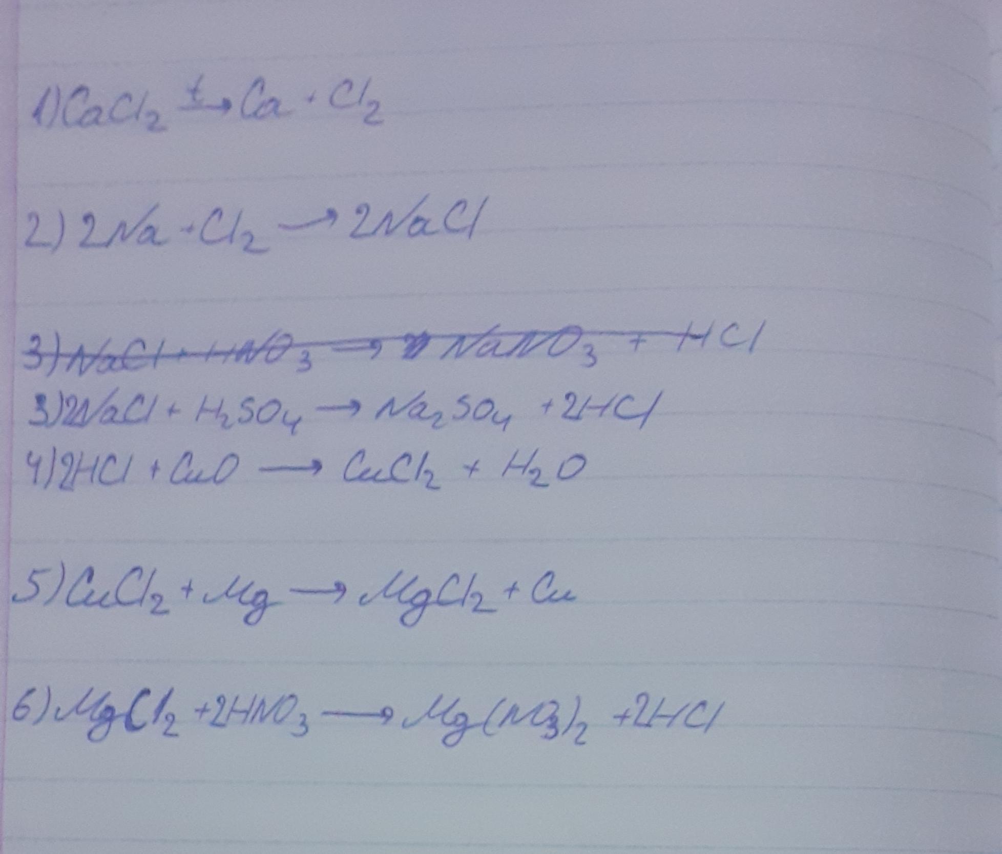 Для получения веществ по указанной схеме превращений CaCl2 → Cl2 → NaCl → HCl → CuCl2 → MgCl2 → Mg(NO3)2 выберите реагенты. Ответ представьте в виде последовательности чисел, соответствующих этим реагентам. 1) H2SO4 2) HNO3 3) Mg 4) Cu 5) F2 6) AgNO3 7) CuO 8) Na
