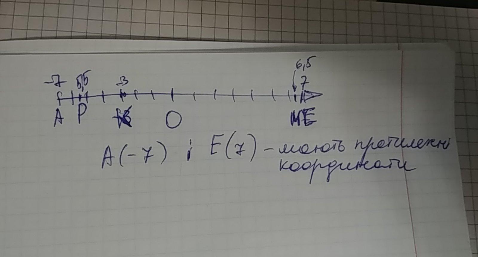 Позначте на кординаткий прямий M( 6,5) E (7) K(-3) A(-7) P( 5,5) Яки з них мають протилежний координати
