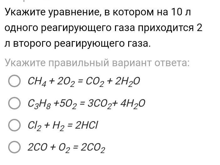 Объёмы газов соотносятся как их коэфициэнты. В первом это 1 к 2, во втором 1/5 = 2/10, в 3: 1/1, в 4: 2/1.