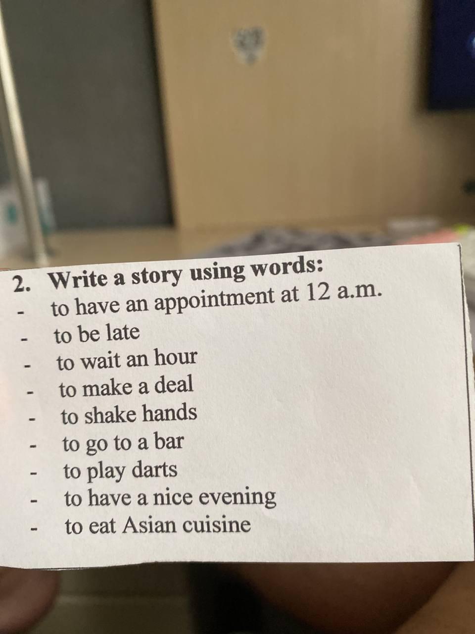 My friends and I set up an appointment at 12 o'clock. My best friend was late for our meeting. We waited for him for about an hour. But despite this, we had a good evening. We were in a restaurant. We ate delicious Asian dishes and then played Darts.