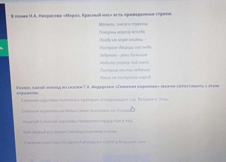 В поэме Н.А. Некрасова «Мороз, Красный нос» есть приведенные строки. Метели, снега и туманы Покорны морозу всегда, Пойду на моря-окияны – Построю дворцы изо льда. Задумаю - реки большие Надолго упрячу под гнет, Построю мосты ледяные, Каких не построит народ. Укажи, какой эпизод из сказки Г.Х. Андерсена «Снежная королева» можно сопоставить с этим отрывком. Снежная королева полетела к кратерам огнедышащих гор, Везувия и этны Снежная королева на белых санях оказалась на площади поцелуй Снежной королевы превратил сердце Кая в лед Кай первый раз видит Снежную королеву в окне Снежная королева посадила Кая рядом с собой в большие сани