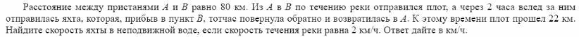 Так как яхта отправилась за плотом через два часа, то приравняем значения: 80 : (x - 2) + 80 : (x + 2) + 2 = 11.