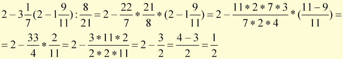 2 отнять 3 целые одна седьмая умножить (2 отнять 1 целую девять одиннадцатых) разделить на восемь двадцать первых