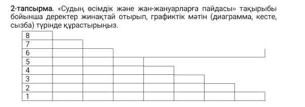 судың өсімдік және жан-жануарларға пайдасы тақырыбы бойынша деректер жинақтай отырып, графиктік мәтін (диаграмма, кесте, сызба) түрінде құрастырыңыз