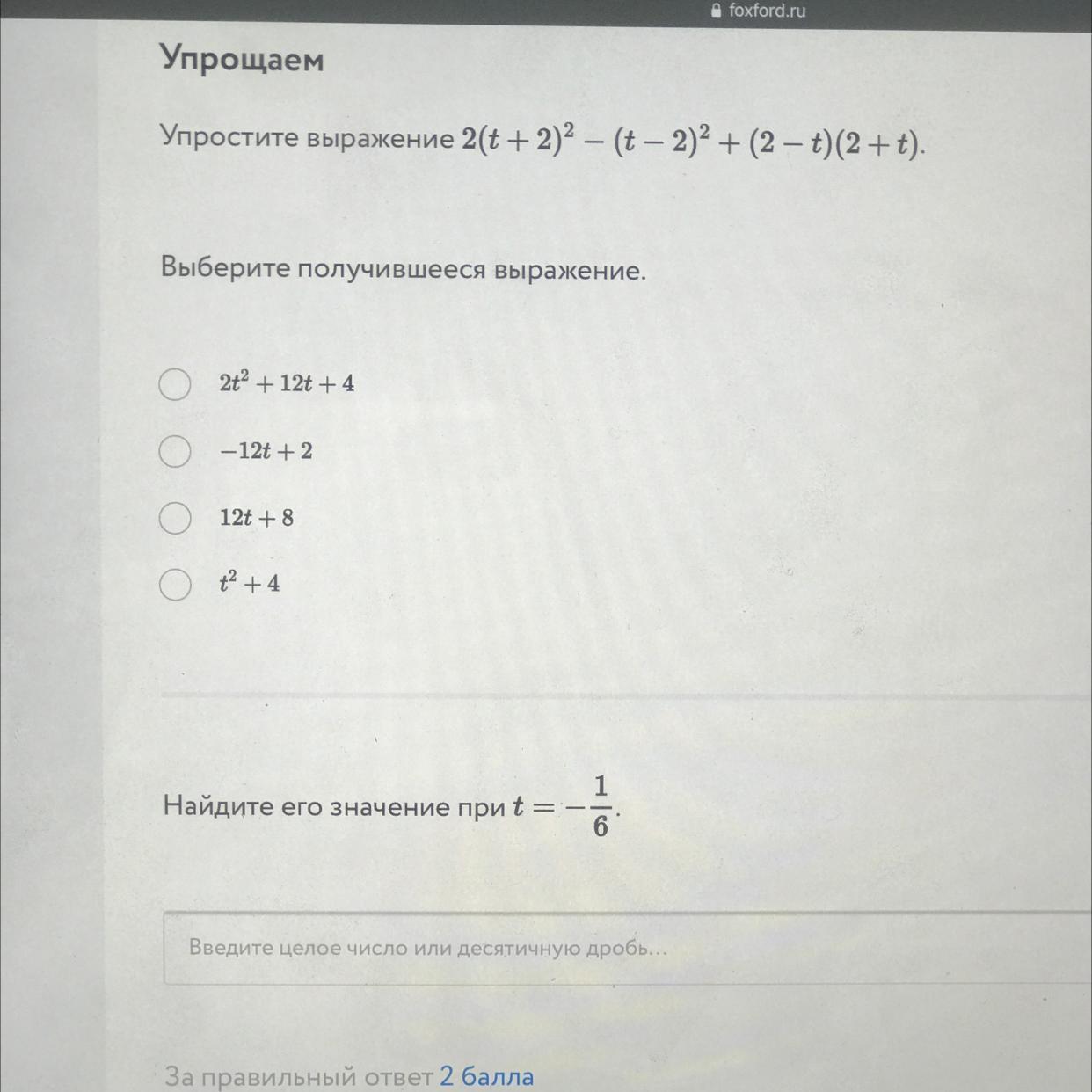 Объяснение: 2(t2 + 4t +4)-(t2-4t+4)+4-t2=2(t2+4t +4)-t2+4t-4+4-t2=2t2+8t+8-t2+4t-t2=0+8t+8+4t= 0+12t+8= 12t+8