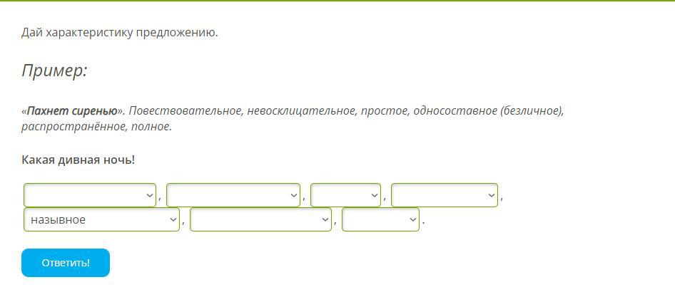 Распространённое, простое, восклицательное, полное, односоставное( назывное), повествовательное