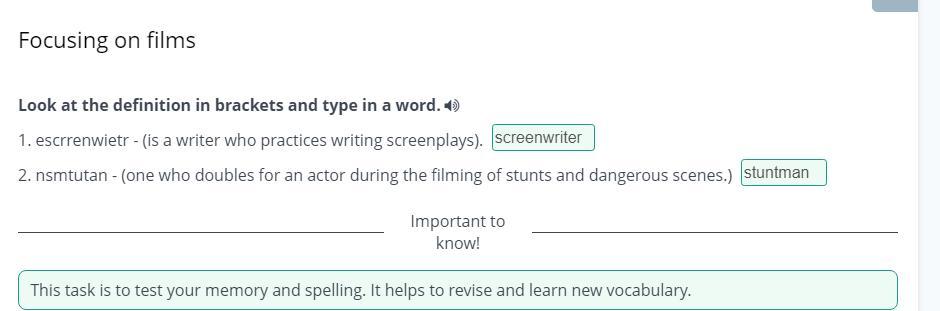 hition in brackets and type in a word. ) a 1. escrrenwietr - (is a writer who practices writing screenplays). 2. nsmtutan - (one who doubles for an actor during the filming of stunts and dar Back Check