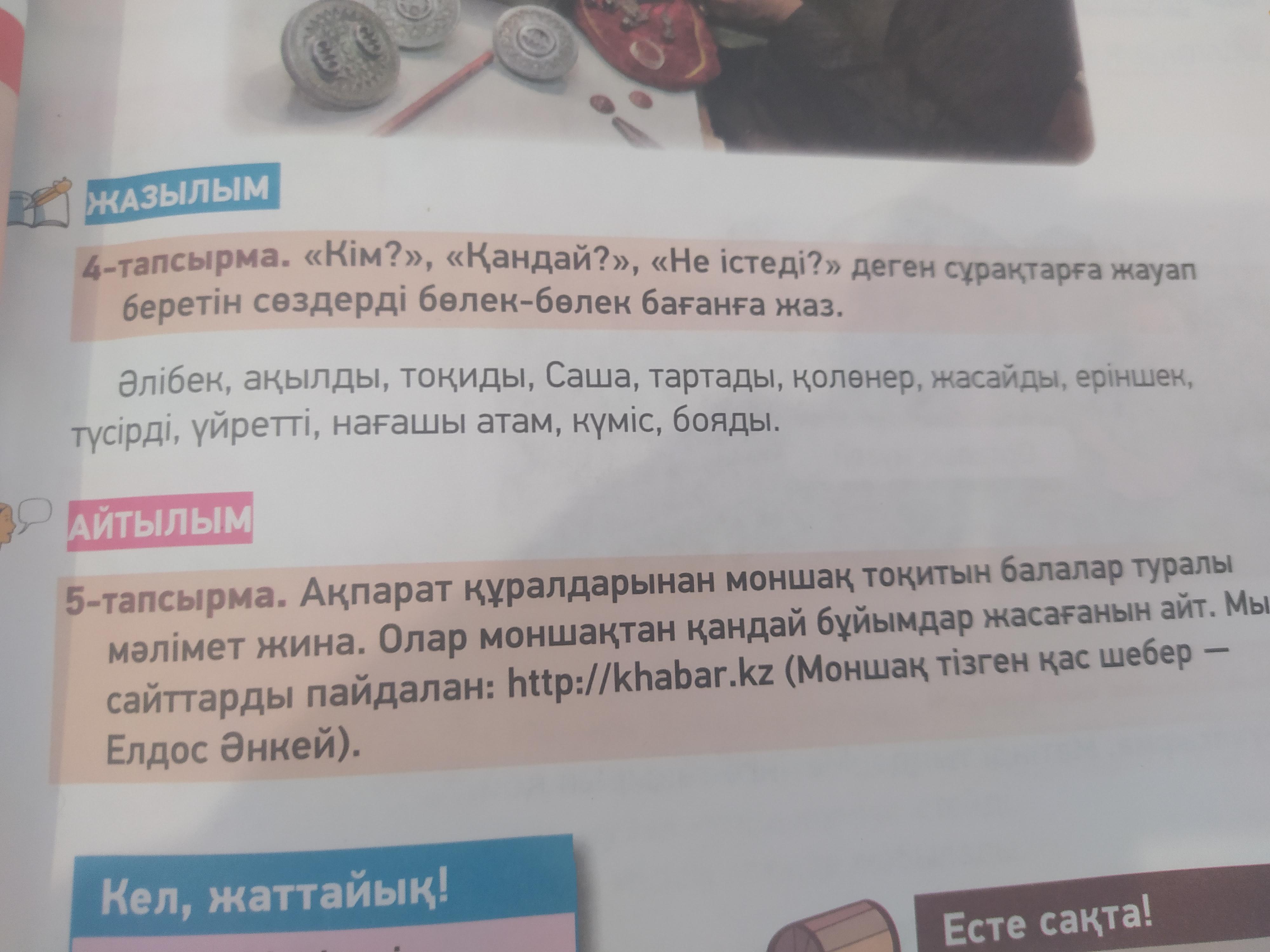 қандай?: күміс,еріншек, ақылды, қолөнер.